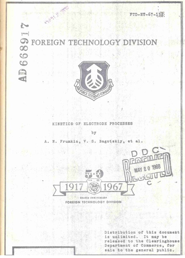 - Frumkin A.N., Bagotsky V.S., Iofa Z.A., Kabanov B.N. *** Kinetics of the electrode processes . Moscow.: Moscow University Publ, 1952. 319 p., in Russian. [Translations: Chinese: Beijing, 1957, 339 p. ; English: Foreign Technol.Div., Nr. FTD-HT-67-153, Wrigt-Patterson Air Force Base, Ohio, 1967, this is a cover.]