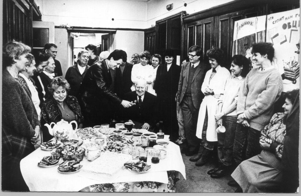 Typical event at the Dept, arranged in a wide corridor. This photo shows celebration of the jubilee of M.I. Revushkin, famous glass-blower (sitting near the table). B.B. Damaskin presents him a gift. Lady sitting at the right is L.N. Balashova, and lady sitting near the table is N.I. Palagina, both are usual mistresses organizing the food for event. This corridor could accommodate several dozens of people, who all could even seat if additional tables and chairs were collected from all the Dept.