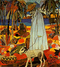 IFrumkin is walking with his fox terrier named Foma. Local lady in the back is reading “Kinetics of electrode processes” textbook. Lopatkin used incrustation by pieces of newspapers and magazines to create this masterpiece.