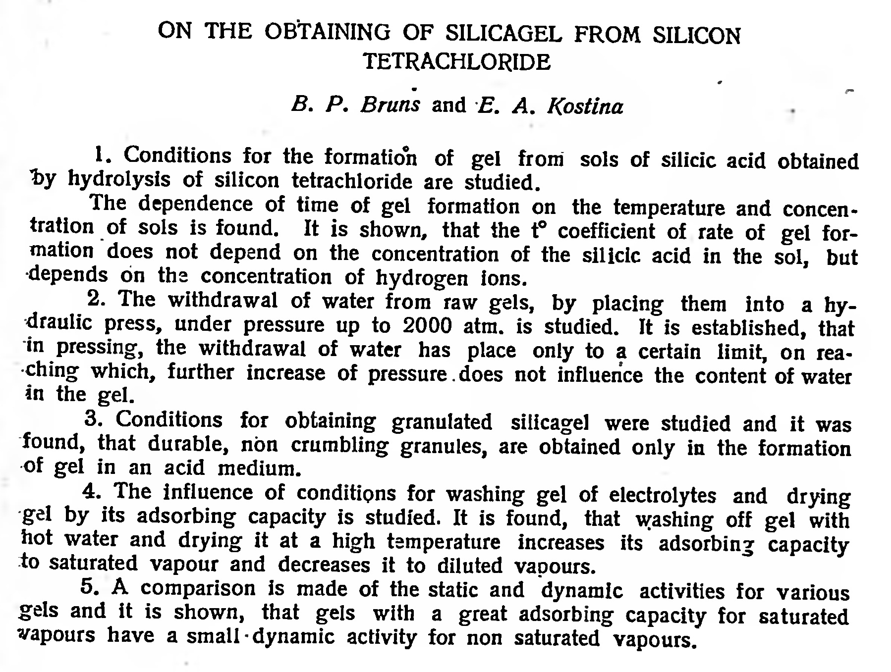 - Bruns B.P., Kostina E.A. On the obtaining of silicagel from silicone tetrachloride // Zhurnal Prikladnoi Khimii. 1935. V. 8. P. 1004-1013, in Russian. Abstract in English.