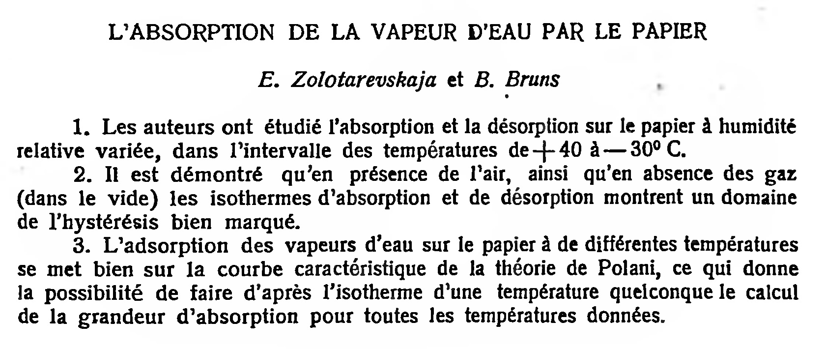 - Zolotarewskaja E., Bruns B. On the sorption of water vapor by paper // Zhurnal Prikladnoi Khimii. 1938. V. 11. P. 1604-1609, in Russian. The study was requested by some paper factory, which provided the samples of two types. Abstract in French.